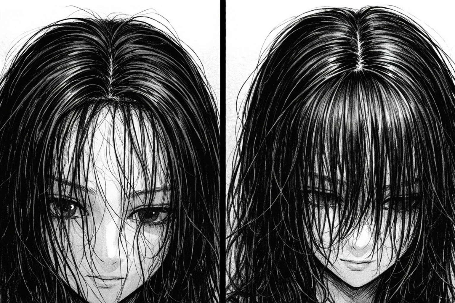 ◎右 薬液で角度を付けて収まりやすく致しました 風で舞っても収まりやすくなります{洗っても元に戻りません}